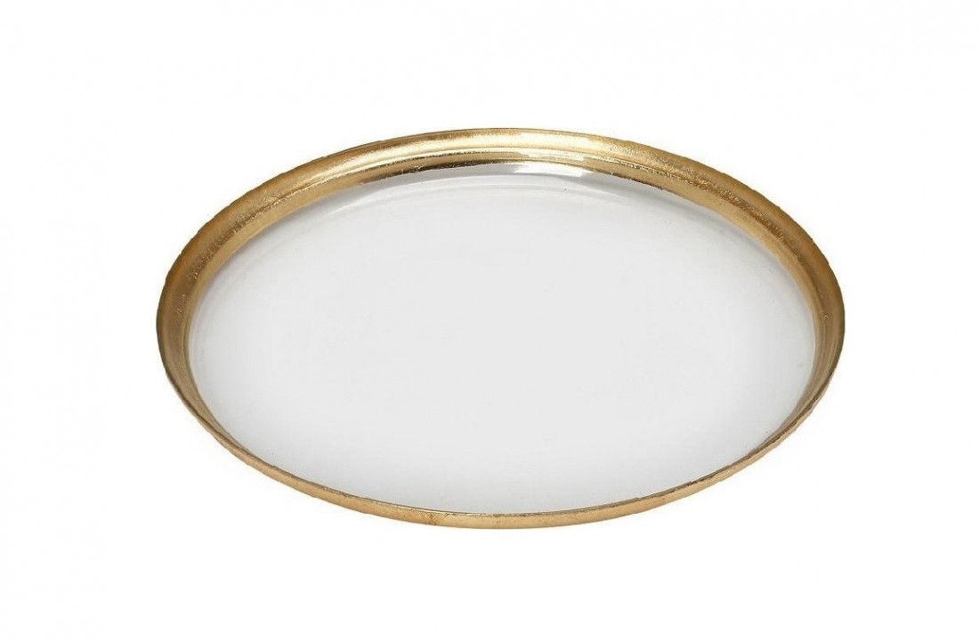 Στρογγυλή πιατέλα σερβιρίσματος από την εταιρεία Espiel. Είναι κατασκευασμένη από διάφανο γυαλί και περιμετρικά στο χείλος έχει χρυσή ρίγα.