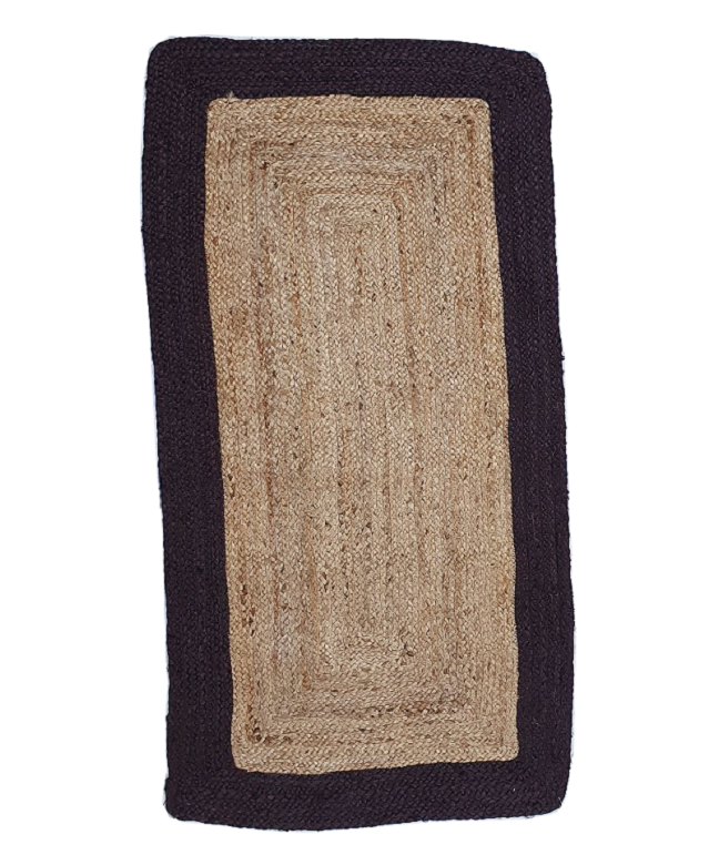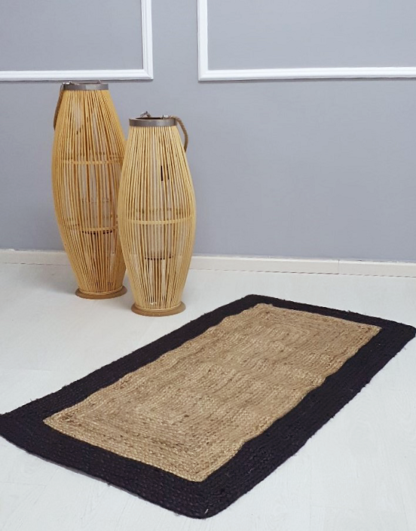 Πλεκτό οικολογικό ορθογώνιο ψάθινο χαλί σε φυσικό χρώμα natural με μαύρη φάσα περιμετρικά που δημιουργεί μια όμορφη κορνίζα , από 100% ίνες του φυτού Γιούτα