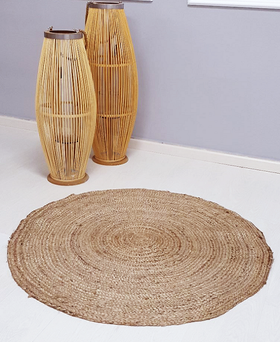 Εντυπωσιακό στρογγυλό boho style χαλί σε διάμετρο 100 εκατ. πλεγμένο με παραδοσιακές τεχνικές. Τα υλικά που χρησιμοποιούνται είναι 100% ίνες του φυτού γιούτα. Ταιριάζει σε σπίτια με μοντέρνα διακόσμηση και δίνει ένα μινιμαλιστικό ρουστίκ ύφος!