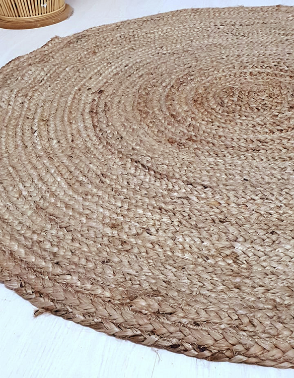 Εντυπωσιακό στρογγυλό  boho style  χαλί σε διάμετρο 120 εκατ.  πλεγμένο με παραδοσιακές τεχνικές. Τα υλικά που χρησιμοποιούνται είναι 100% ίνες του φυτού γιούτα. Ταιριάζει σε σπίτια με μοντέρνα διακόσμηση και δίνει ένα μινιμαλιστικό ρουστίκ ύφος!