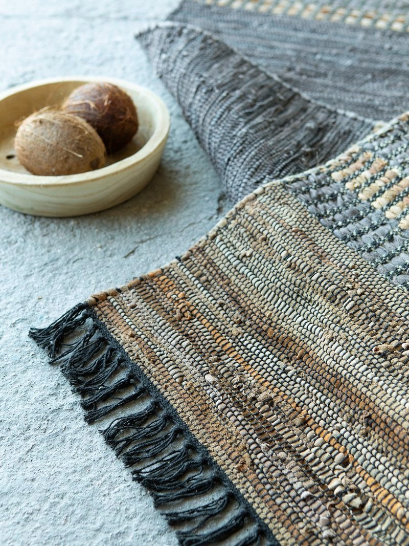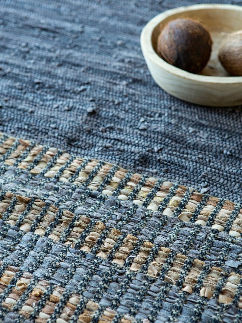 Χαλί χειροποίητο από 85% δέρμα και 15% ίνες κάνναβης. Ένα χαλί που έρχεται στο σπίτι για να μείνει για πάντα. Χάρη στη σύνθεση του είναι από τα πιο ανθεκτικά που μπορείτε να επιλέξετε. Έχει χαμηλό πέλος και είναι ιδανικό για πολυσύχναστα δωμάτια και περάσματα μιας και έχει υψηλή αντοχή στη συχνή, καθημερινή χρήση όλο το χρόνο.
