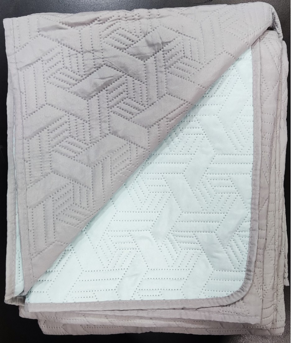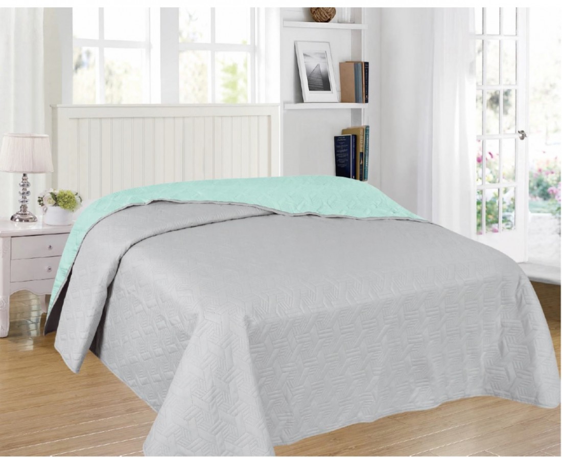 Το κουβερλί Geo- Mint/ Gray είναι διπλής όψης και συνδιάζει δύο ουδέτερα και διαχρονικά χρώματα. Η απόχρωση του γκρι από την μία πλευρά αναδεικνύει την απλή, χαλαρή διακόσμηση, ενώ το χρώμα της μέντας από την άλλη πλευρά μπορεί να συμμετέχει σε μια διακόσμηση με φρέσκες παστέλ αποχρώσεις. Και οι δύο πλευρές του μπορούν να συνδυαστούν εύκολα με τα χρώματα που θα επιλέξετε εσείς. Είναι μονόχρωμο και έχει γεωμετρικό, ανάγλυφο καπιτονάρισμα που τονίζει την ωραία υφή του και ταιριάζει πολύ εύκολα με κάθε στιλ διακόσμησης.
