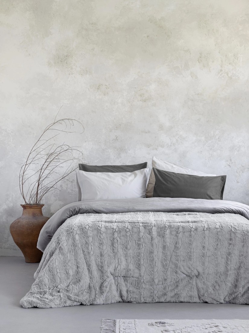 To Κουβέρτo-Πάπλωμα Velure Light Gray σε ανοιχτόχρωμη απόχρωση του γκρι, έχει ανάγλυφη ύφανση που θυμίζει γούνα, για ακόμα πιο χουχουλιάρικη αίσθηση. Στην εσωτερική του πλευρά έχει απαλή, λεία velour υφή για μεγαλύτερη άνεση στον ύπνο. Το σχέδιό του ταιριάζει εύκολα σε μοντέρνο αλλά και κλασικό στιλ διακόσμησης, φέρνοντας τη ζεστή θαλπωρή που επιθυμούμε να έχει το σπίτι μας όταν κρυώνει ο καιρός. Είναι ιδανικό για να σας αγκαλιάσει απαλά τα χειμωνιάτικα βράδια ενώ χαλαρώνετε ή απολαμβάνετε τον ύπνο σας.