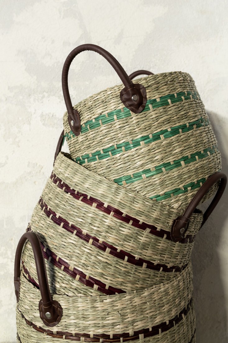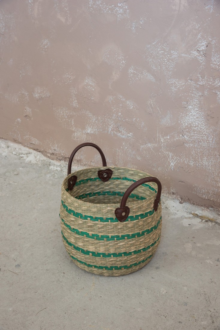 Το διακοσμητικό καλάθι Laila έχει υπέροχο, φυσικό μπεζ χρώμα και όμορφες διακοσμητικές ρίγες περιμετρικά σε πράσινη ή καφέ απόχρωση. Οι δερμάτινες χειρολαβές του προσφέρουν μια αυθεντική αισθητική αίσθηση και ταιριάζουν άψογα με την παραδοσιακή σφιχτή πλέξη και το στρογγυλό του σχήμα. Ένα καλάθι που θα διακοσμήσει και θα αναβαθμίσει την αισθητική του σπιτιού φέρνοντας μια φυσική αίσθηση στον χώρο. Προσφέρεται σε 3 διαστάσεις για να επιλέξετε ή να τις συνδυάσετε για ένα ολοκληρωμένο αισθητικό αποτέλεσμα