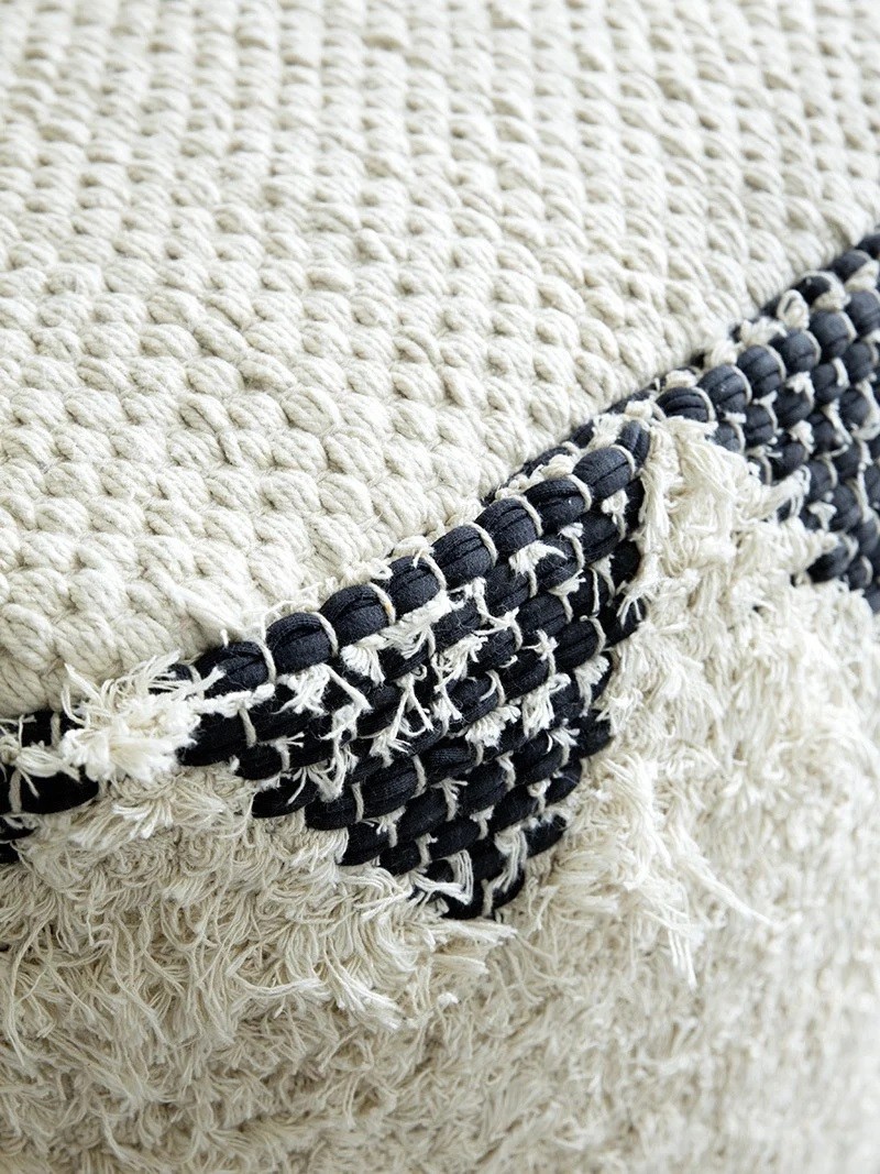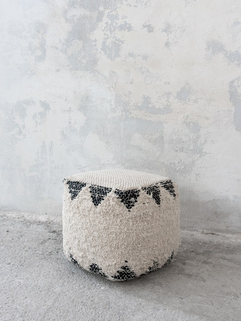 Το Πουφ Calif έχει φωτεινό εκρού χρώμα που πλαισιώνεται με μαύρο γεωμετρικό μοτίβο σε σχήμα τρίγωνου. Η υπέροχη ανάγλυφη υφή του, θυμίζει χαλί. Με μινιμαλιστικό design και όμορφες λεπτομέρειες, ανήκει δικαίως στις πιο σύγχρονες τάσεις της μόδας του σπιτιού. Ταιριάζει πολύ εύκολα σε πολλά διαφορετικά στιλ διακόσμησης. Μια εξαιρετική επιλογή που δημιουργεί αίσθηση ζεστασιάς στον χώρο και παράλληλα μια πολύ μοντέρνα αισθητική άποψη για το σύγχρονο σπίτι.