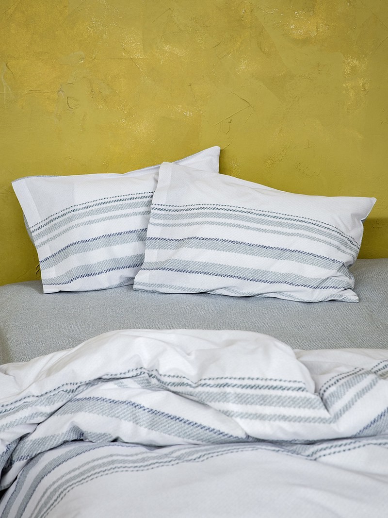 Το σετ μαξιλαροθήκες Level Blue έχει διαχρονικό ριγέ γεωμετρικό μοτίβο στις μοντέρνες αποχρώσεις του γκρι - γαλάζιου πάνω σε εκρού βάση με μια πινελιά σκούρου μπλε, που τονίζει το διακριτικό ριγέ σχέδιό τουs. Ταιριάζουν σε χώρους με μοντέρνα, αλλά και με κλασική διακόσμηση μιας και μπορούν να σταθούν ως το επίκεντρο της συνολικής αισθητικής του χώρου. Δώστε στο υπνοδωμάτιο σας προσωπικότητα με μια από τις πιο σύγχρονες τάσεις σε μια ανάλαφρη εκδοχή.