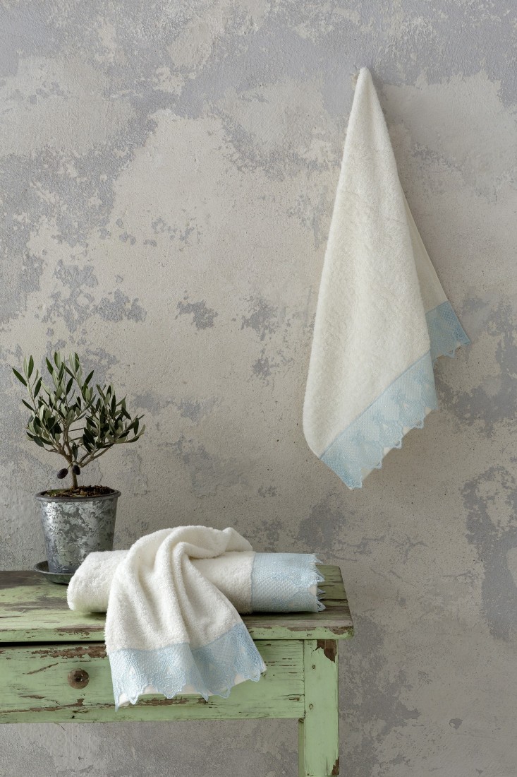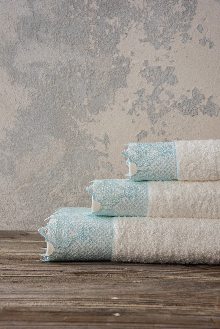 Η βαμβακερή πετσέτα Amaia Light Blue έχει ουδέτερο εκρού χρώμα που και είναι διακοσμημένη με μια υπέροχη τρέσα από δαντέλα με ethnik μοτίβο με λαχούρι σε γαλάζιο χρώμα. Τα παστέλ χρώματα και η φάσα με την δαντέλα δίνουν μια ρομαντική αισθητική και ένα μοναδικό στιλ στο μπάνιο. Μια πετσέτα με ιδιαίτερο σχέδιο και εξαιρετική ποιότητα που θα λατρέψετε. Προσφέρεται σε 3 διαστάσεις, χεριών, προσώπου, μπάνιου και σε σετ τριών τεμαχίων. Συνδυάστε τις για μια ομοιόμορφη και αισθητικά αρμονική εικόνα στο μπάνιο σας.