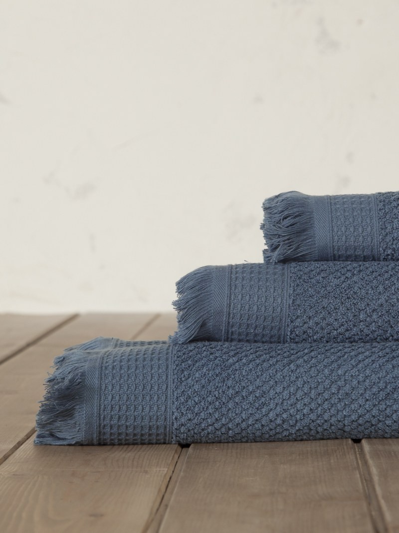 Η βαμβακερή πετσέτα Dorinda Blue έχει διαχρονικό μπλε χρώμα και ανάγλυφο γεωμετρικό σχέδιο σε όλη την επιφάνεια της πετσέτας, ενώ το τελείωμά της είναι με πλούσιο κρόσι. Θα τη βρείτε σε 3 διαστάσεις, χεριών, προσώπου, μπάνιου για να δημιουργήσετε αρμονία και να δώσετε μοντέρνα όψη στο μπάνιο σας. Με το διαχρονικό της σχέδιο θα αναβαθμίσει το χώρο σας  ενώ η εξαιρετική της ποιότητα θα την κάνει απαραίτητη στην καθημερινότητά σας .