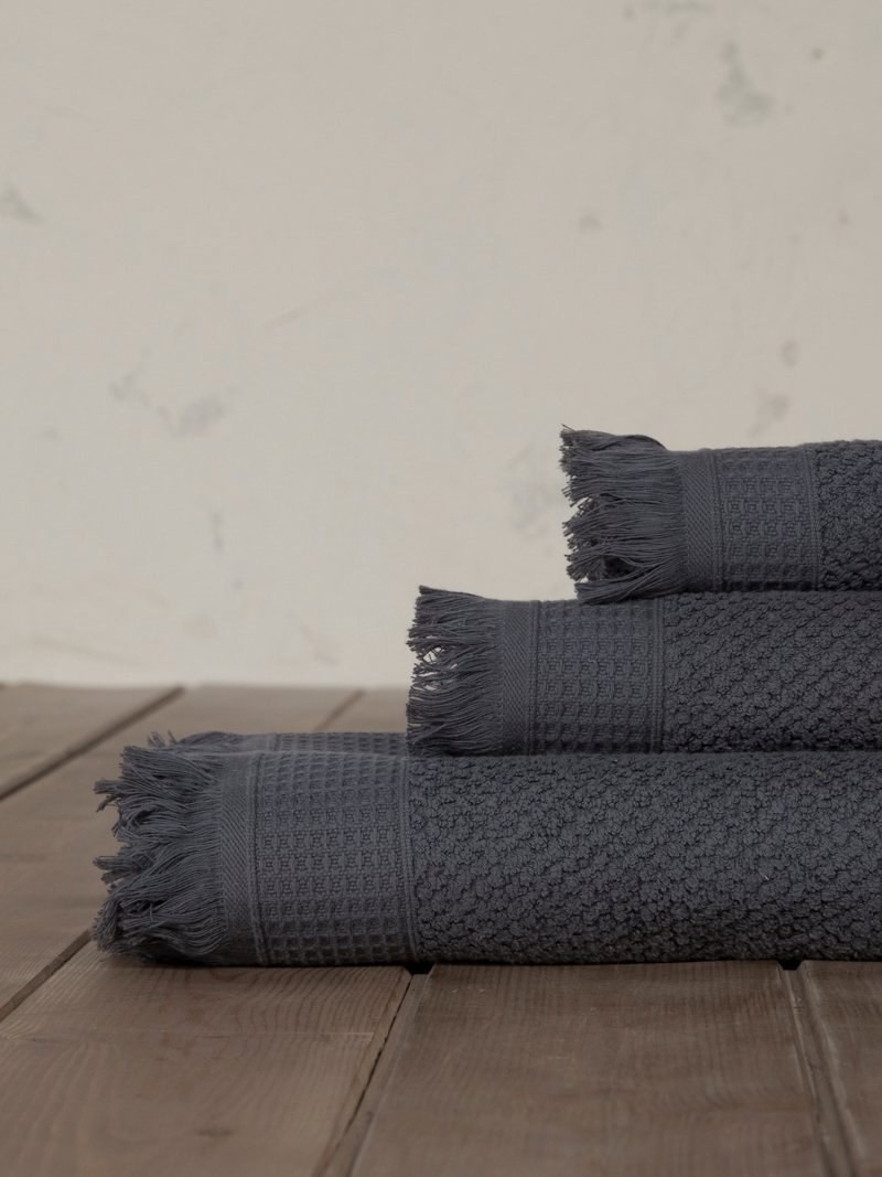 Η βαμβακερή πετσέτα Dorinda Dark Gray έχει διαχρονικό σκούρο γκρι χρώμα και ανάγλυφο γεωμετρικό σχέδιο σε όλη την επιφάνεια της πετσέτας, ενώ το τελείωμά της είναι με πλούσιο κρόσι. Θα τη βρείτε σε 3 διαστάσεις, χεριών, προσώπου, μπάνιου για να δημιουργήσετε αρμονία και να δώσετε μοντέρνα όψη στο μπάνιο σας. Με το διαχρονικό της σχέδιο θα αναβαθμίσει το χώρο σας  ενώ η εξαιρετική της ποιότητα θα την κάνει απαραίτητη στην καθημερινότητά σας .