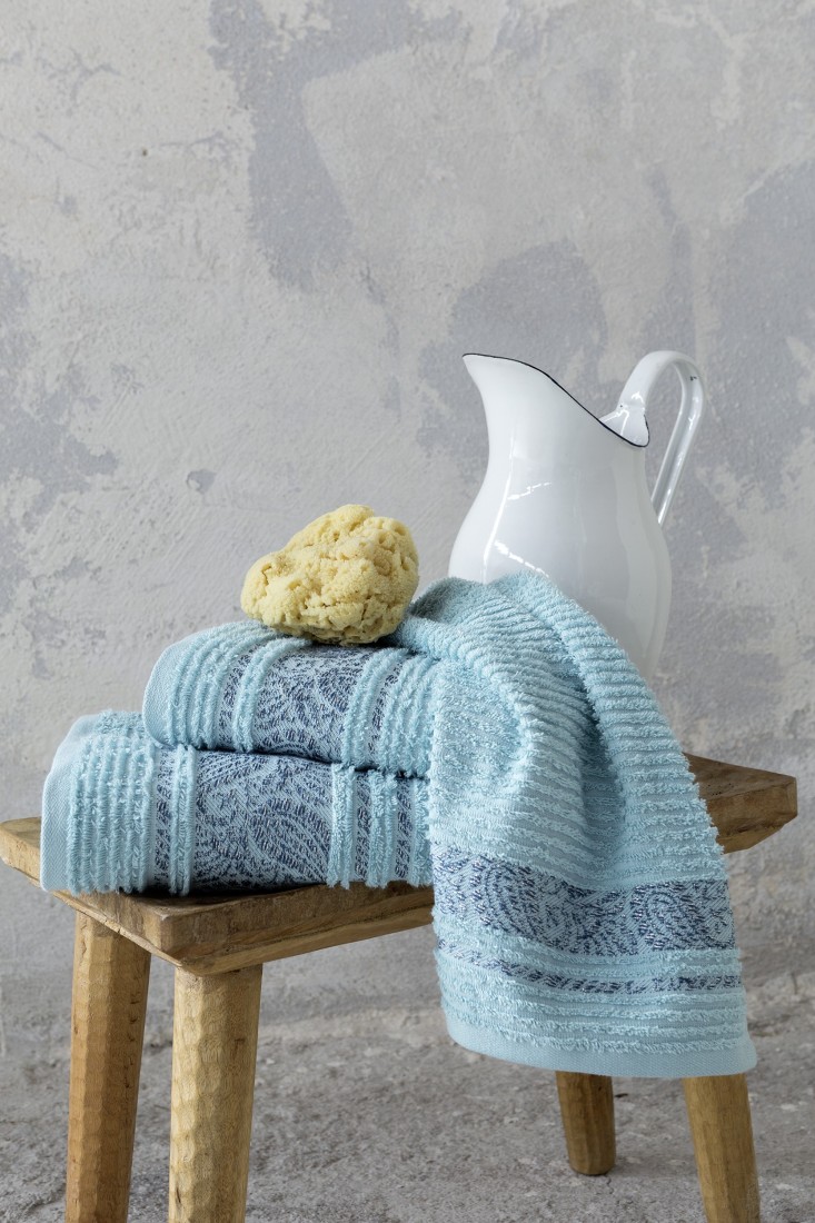 Η βαμβακερή πετσέτα Αishun έχει ελαφρύ μπλε χρώμα και ύφανση jacquard με ethnic μοτίβο στην φάσα, που αναδεικνύεται ακόμα περισσότερο με την διακριτική προσθήκη μεταλλιζέ κλωστής. Μια πετσέτα που θα ξεχωρίσει χάρη στην υπέροχη αισθητική, το ιδιαίτερο σχέδιο και την ποιότητά της. Προσφέρεται σε 3 διαστάσεις, χεριών, προσώπου, μπάνιου και σε σετ τριών τεμαχίων. Συνδυάστε τις για μια ομοιόμορφη και αισθητικά αρμονική εικόνα στο μπάνιο σας. Ιδανική για δώρο, λόγω της ξεχωριστής διακοσμητικής φάσας.