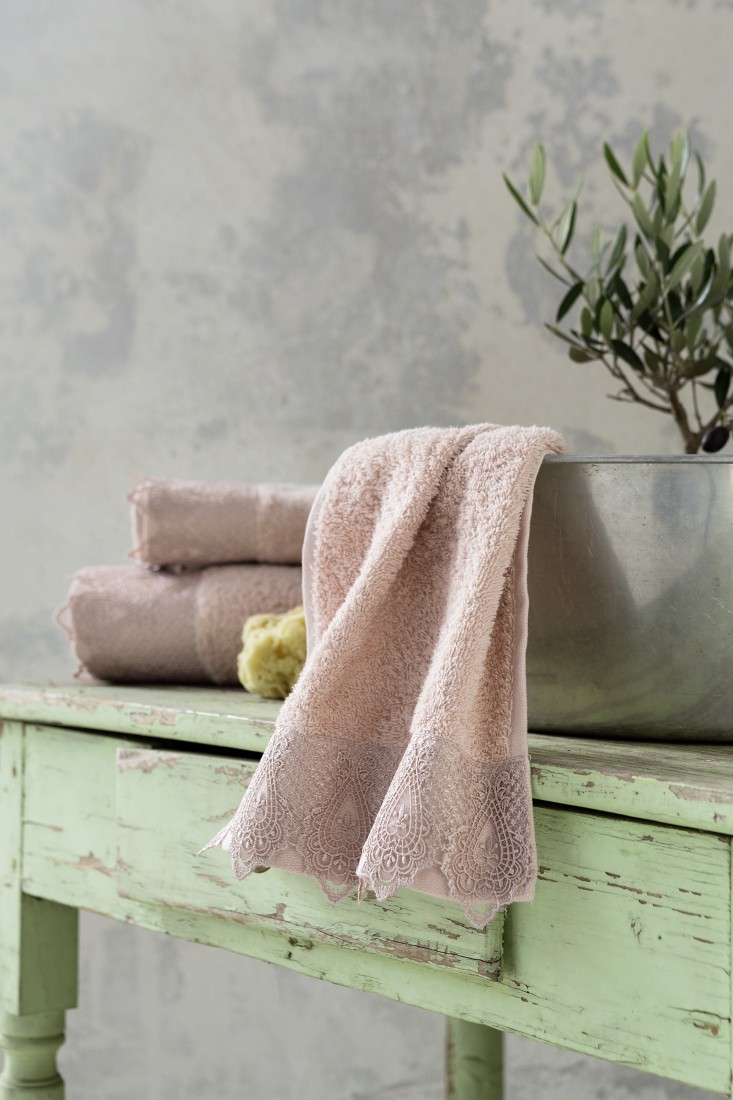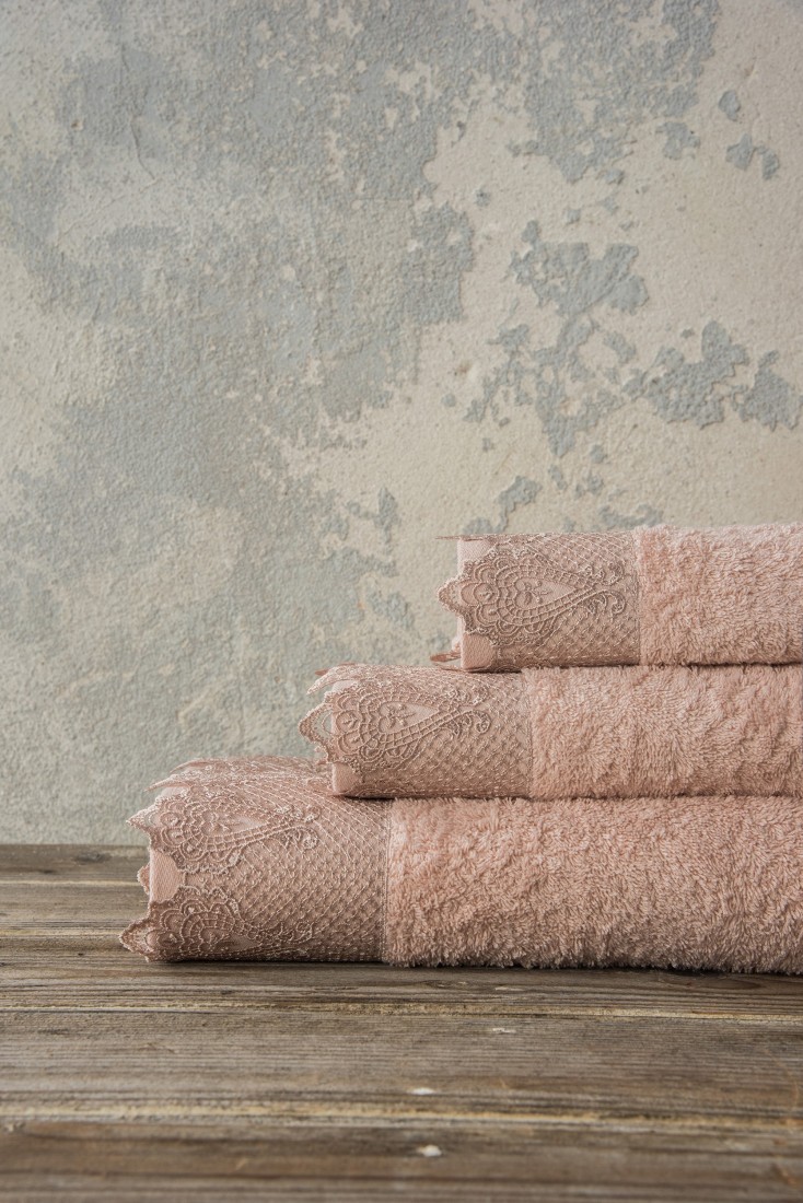 Η βαμβακερή πετσέτα Amaia Pink έχει υπέροχο ροζ χρώμα που ταιριάζει με πολλές αποχρώσεις. Είναι διακοσμημένη με μια υπέροχη τρέσα από δαντέλα με ethnik μοτίβο με λαχούρι που την κάνει να ξεχωρίζει. Το παστέλ ροζ χρώμα της σε πετσέτα και δαντέλα δίνει μια ρομαντική αισθητική στο χώρο και προσφέρει μοναδικό στιλ στο μπάνιο. Μια πετσέτα με ιδιαίτερο σχέδιο και εξαιρετική ποιότητα που θα λατρέψετε. Προσφέρεται σε 3 διαστάσεις, χεριών, προσώπου, μπάνιου και σε σετ τριών τεμαχίων. Συνδυάστε τις για μια ομοιόμορφη και αισθητικά αρμονική εικόνα στο μπάνιο σας.