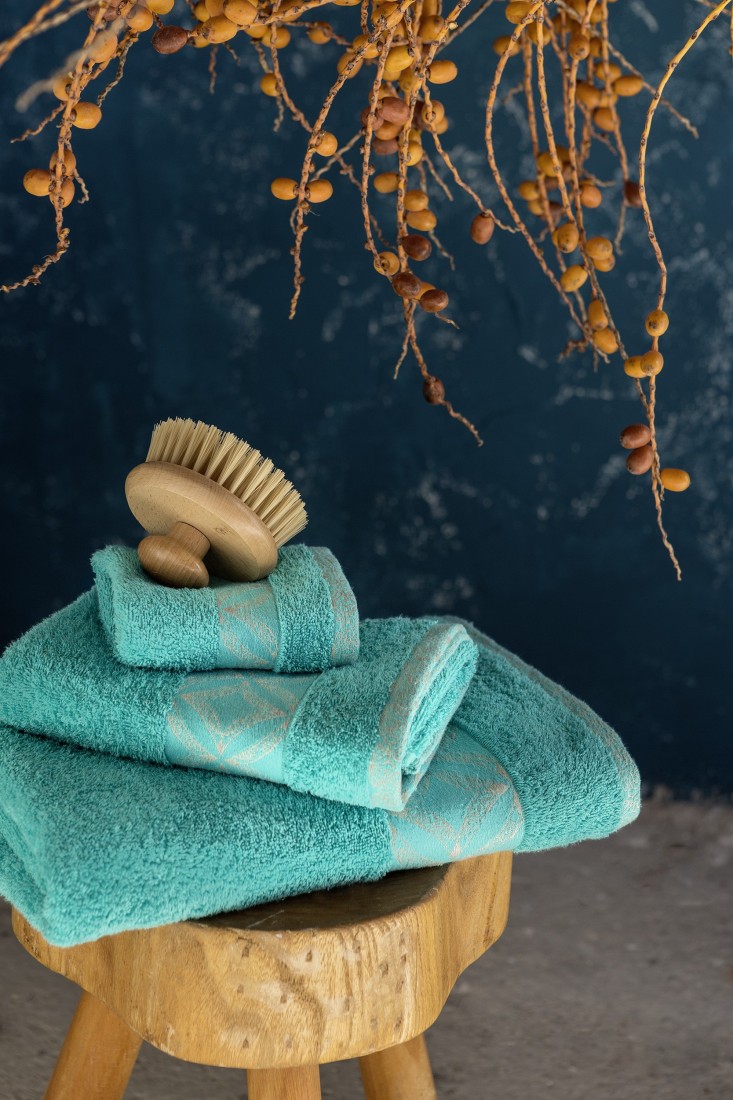 Η βαμβακερή πετσέτα Leona έχει ιδιαίτερο σμαραγδί χρώμα εμπνευσμένο από τις όμορφες θάλασσες των νησιών μας. Η διακοσμητική της φάσα με ethnic σχέδιο σε ανοικτό γκρι χρώμα, δίνει ένα φίνο τελείωμα στην πετσέτα που την κάνει μοναδική. Μια πετσέτα με υπέροχη αισθητική που θα δώσει χαρακτήρα στο μπάνιο σας. Προσφέρεται σε 3 διαστάσεις, χεριών, προσώπου, μπάνιου και σε σετ τριών τεμαχίων. Συνδυάστε τις για να φέρετε στο μπάνιο σας μια αισθητική αρμονία που θα το αναδείξει.