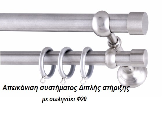 - Στην περίπτωση που επιλέξετε διπλή κουρτινόβεργα με εσωτερικό σωλήνα Φ.20 περιλαμβάνει επίσης σωλήνα νίκελ Φ20 χιλιοστά διάμετρο δύο τάπες δύο οκταράκια στήριξης και δέκα κρίκους ανά μέτρο.
