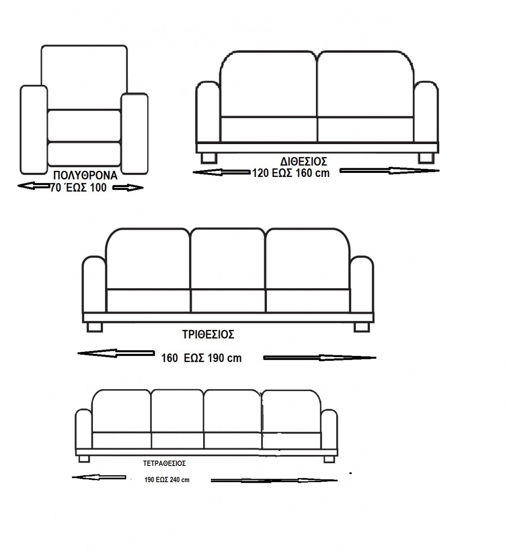 • Διθέσιος καναπές: πλάτη 110–160 cm
