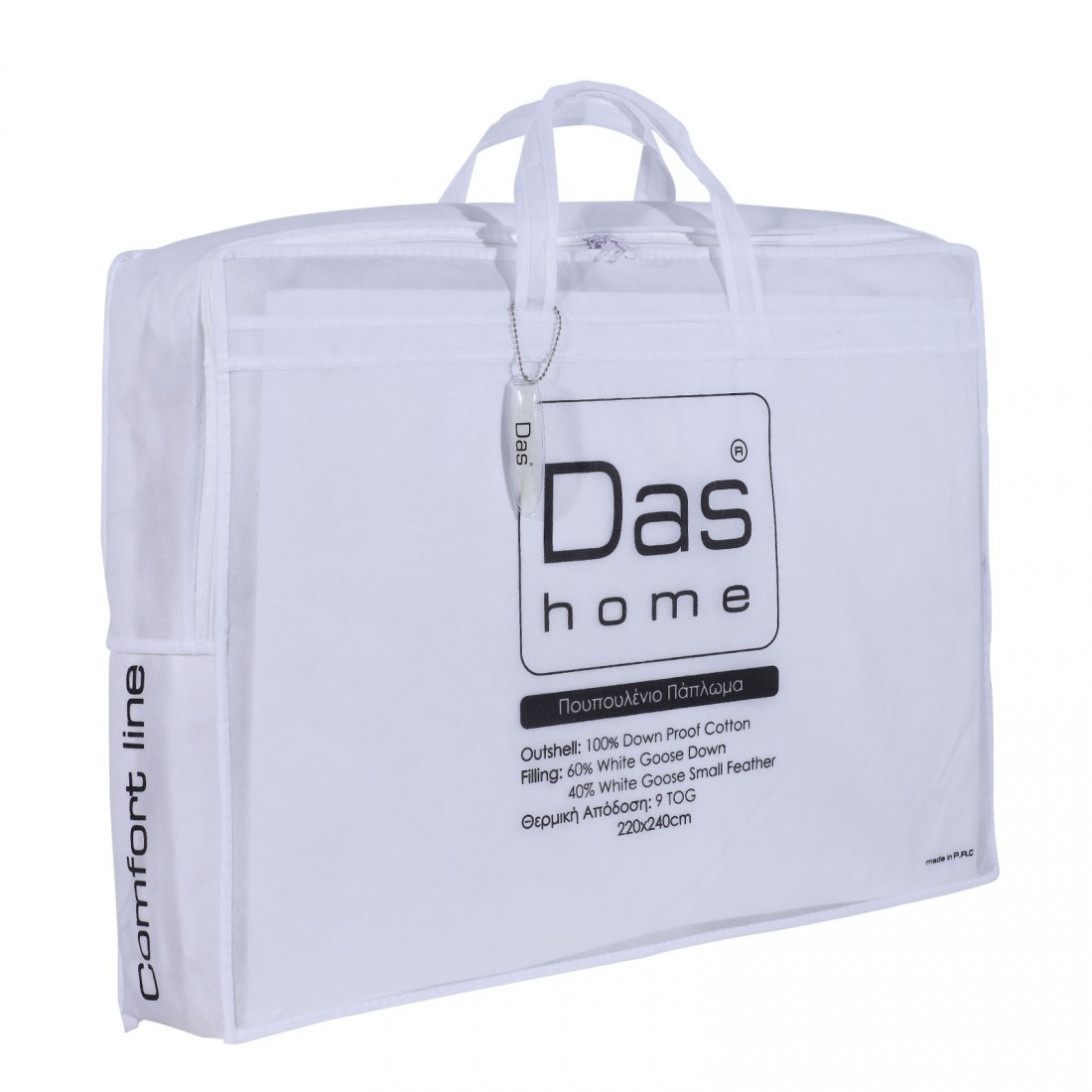 Πουπουλένιο πάπλωμα της σειράς Comfort. Το κάλυμμα του είναι από υποαλλεργικό βαμβακερό ύφασμα ειδικά επεξεργασμένο για την συγκράτηση του υλικού γεμίσματος, ενώ το εσωτερικό του αποτελείται από πούπουλο νεοσσού χήνας και φτεράκι. _x000D_Ιδιαίτερα "αφράτο", απαλό και ανθεκτικό στη χρήση. _Διατίθεται σε διάσταση 220Χ240cm. Ύφασμα: 100% Βαμβάκι. Γέμιση: 60% πούπουλο νεοσσού χήνας - 40% φτεράκι. Θερμότητα: 9 Tog. Πλύσιμο στους 40°C. Όχι σιδέρωμα. Όχι χρήση χλωρίου ή λευκαντικού. Στεγνό καθάρισμα.