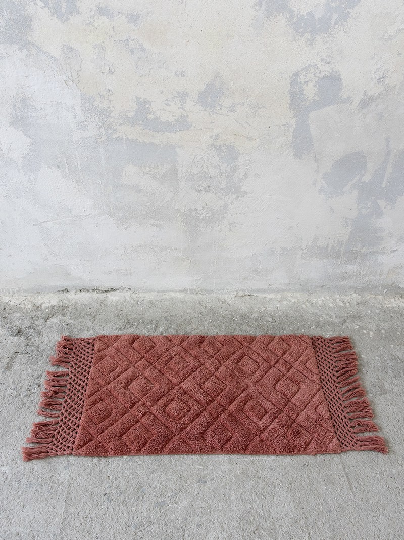 To πατάκι μπάνιου Lucia Terracotta σε γήινο χρώμα τερακότας έχει υπέροχο ανάγλυφο σχέδιο σε σχήμα διαμαντιού και διακοσμητική πλέξη με κρόσσια στο φινίρισμα. Η πολυτελής υφή και αίσθηση που προσφέρει θα αναβαθμίσει τον χώρο του μπάνιου προσφέροντας ταυτόχρονα μια διακριτική boho πινελιά. Ιδανική επιλογή για όσους θέλουν ένα μονόχρωμο πατάκι, χωρίς όμως να θυσιάσουν το design. Είναι σημαντικό να σκουπίζετε τακτικά το πατάκι σας για να απομακρύνετε τη σκόνη, αλλά προσέξτε ιδιαίτερα όταν σκουπίζετε με την ηλεκτρική σκούπα τις άκρες του για να αποφύγετε τυχόν ξεφτίσματα στα κρόσσια.