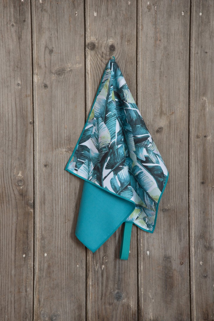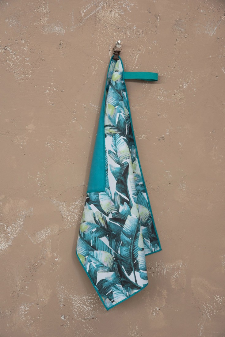 Οι πετσέτα κουζίνας Hana είναι διπλής όψης. Μονόχρωμη μπλε από την μία πλευρά, ενώ από την άλλη έχει tropical jungle σχέδιo σε μοντέρνες αποχρώσεις του μπλε, που μεταφέρει τις φυλλωσιές του τροπικού δάσους στην κουζίνα σας. Διαθέτει μια πρακτική θηλιά που την κρατά σταθερή όταν διπλώνει και μπορεί να χρησιμοποιηθεί και για να την κρεμάσετε όπου σας εξυπηρετεί. Ένα διαφορετικό και εύχρηστο πετσετάκι για καθημερινή χρήση.