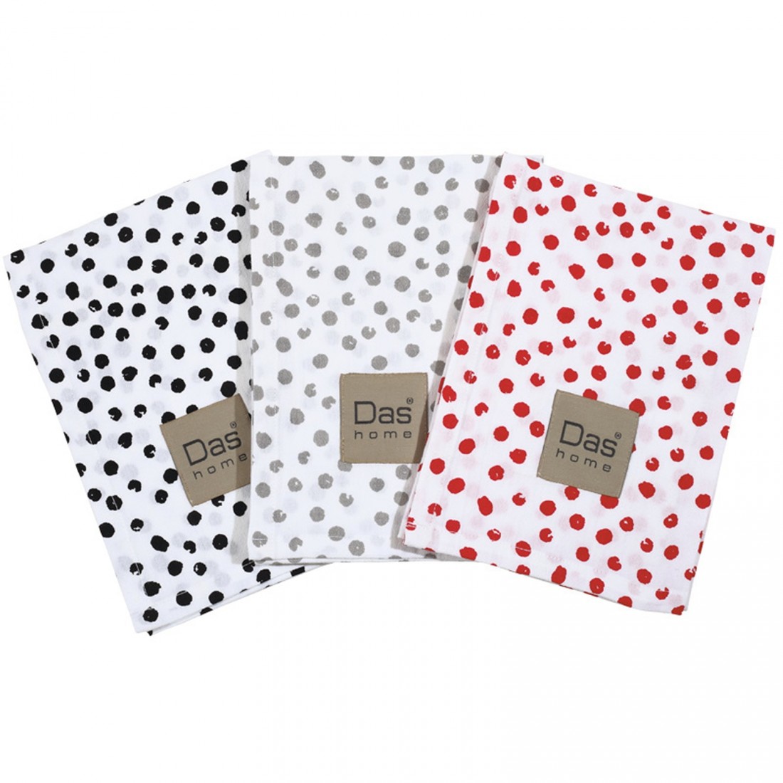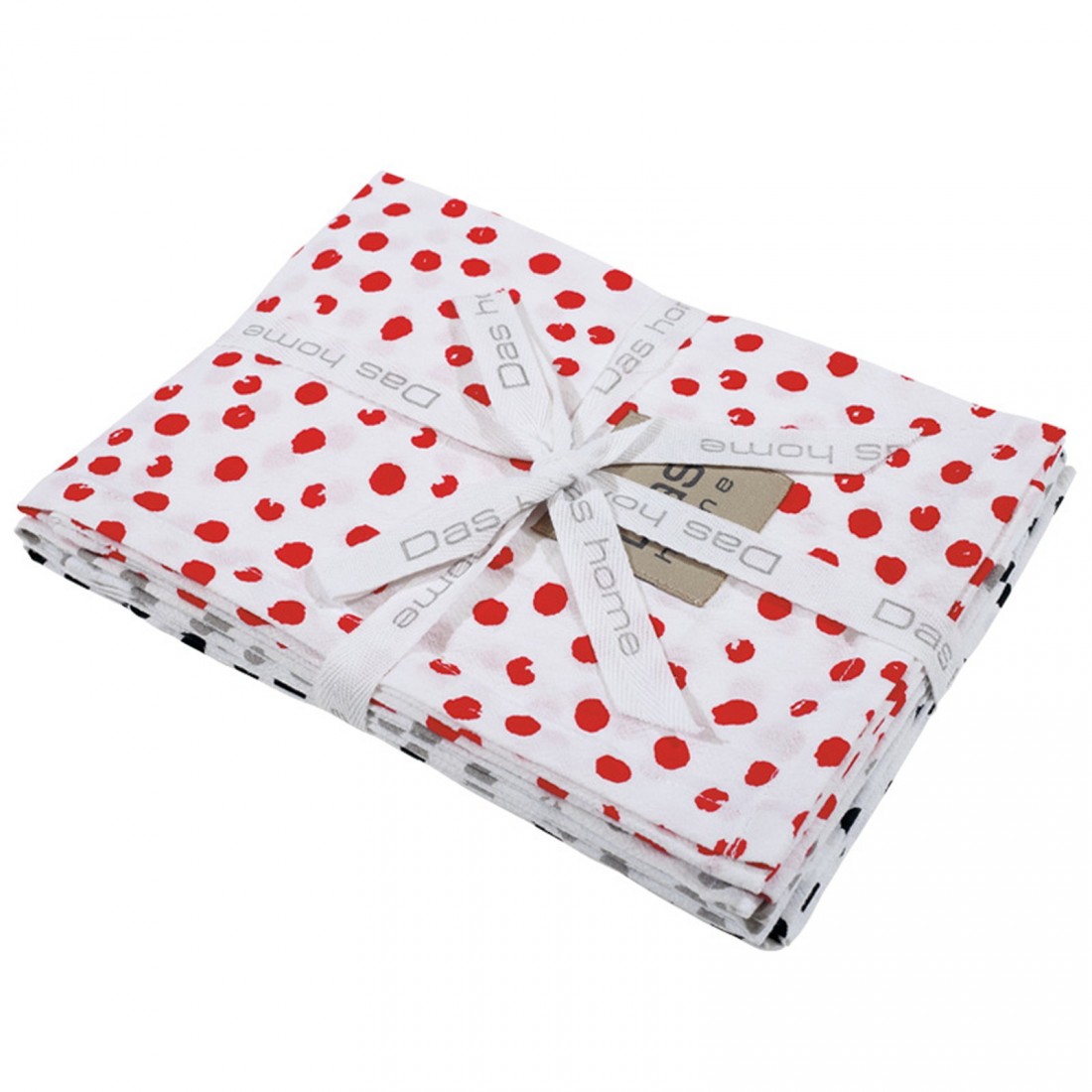 Δώστε στυλ στη κουζίνα σας με τα εμπριμέ ποτηρόπανα της Das home. Ιδιαίτερα εύχρηστα, ανθεκτικά στη χρήση και πολύ απορροφητικά. Το σετ αποτελείται από τρία ποτηρόπανα διάστασης 45x65cm. Σύνθεση: 100% Βαμβάκι Πλύσιμο στους 40°C. Σιδέρωμα σε μέτρια θερμοκρασία. Όχι χρήση χλωρίου ή λευκαντικού. Χρήση στεγνωτηρίου σε χαμηλή θερμοκρασία. Όχι στεγνό καθάρισμα.