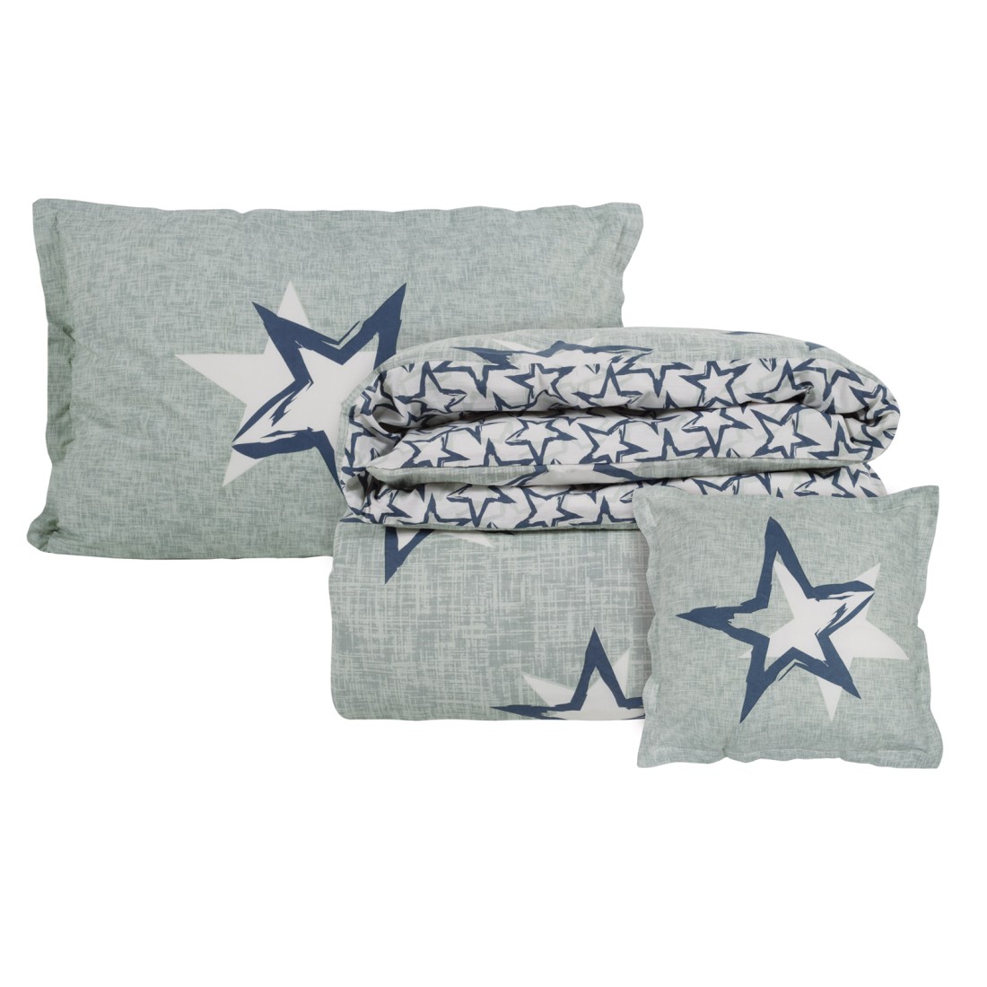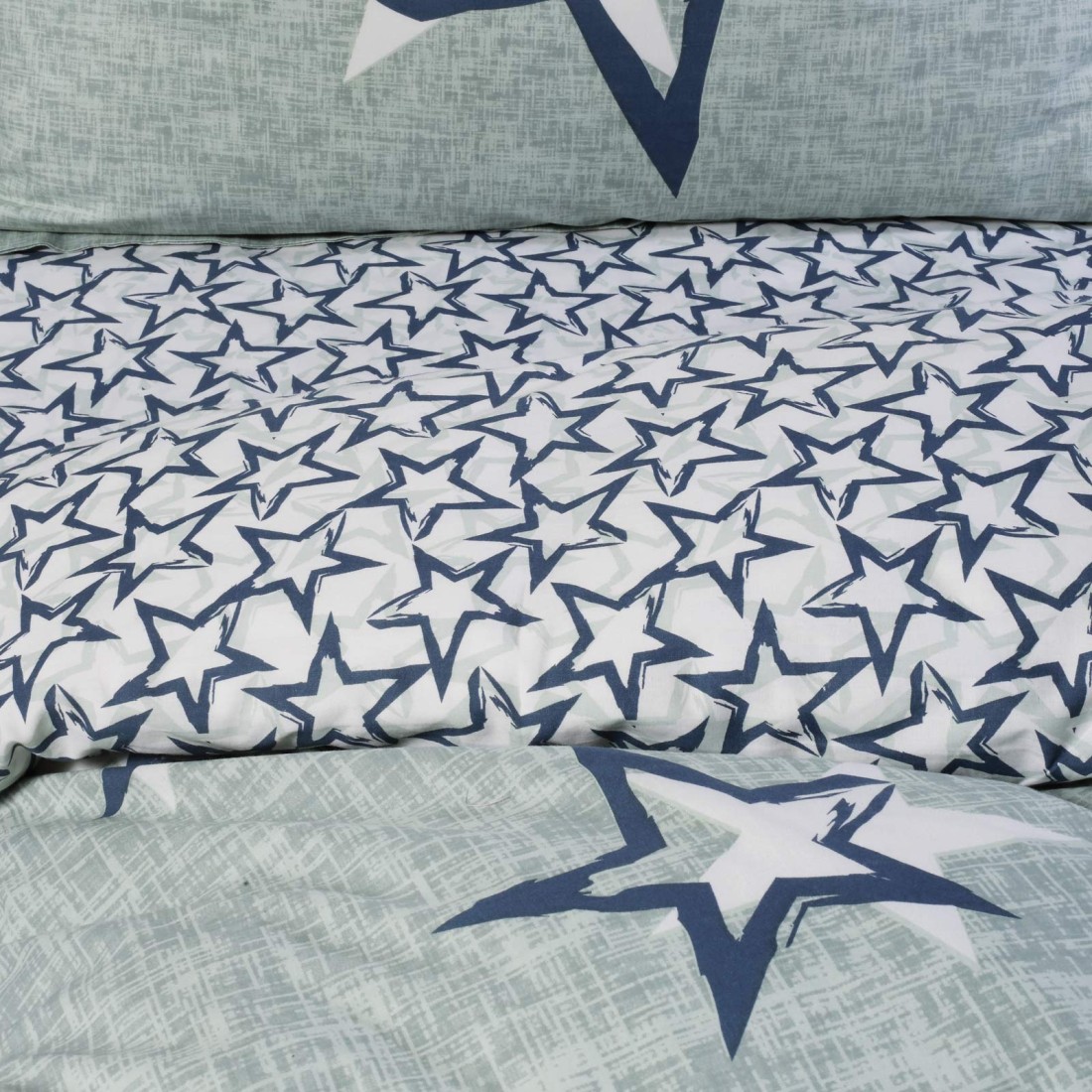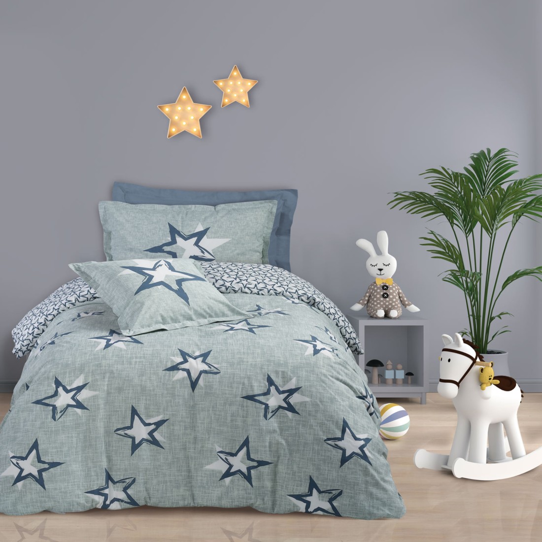 Παιδικά σεντόνια σετ σε μπλε-γκρι αποχρώσεις και σχέδιο αστεράκια από την εταιρία Das. Κατασκευασμένα από 100% υποαλλεργικό βαμβάκι 160 κλωστών, είναι εξαιρετικά απαλά, ανθεκτικά και εύκολα στο σιδέρωμα. Το κατωσέντονο έχει λευκό φόντο με μπλε αστεράκια. Το σχέδιο και τα χρώματά του το καθιστούν κατάλληλο για παιδικά και εφηβικά δωμάτια.