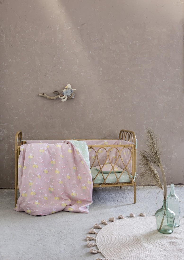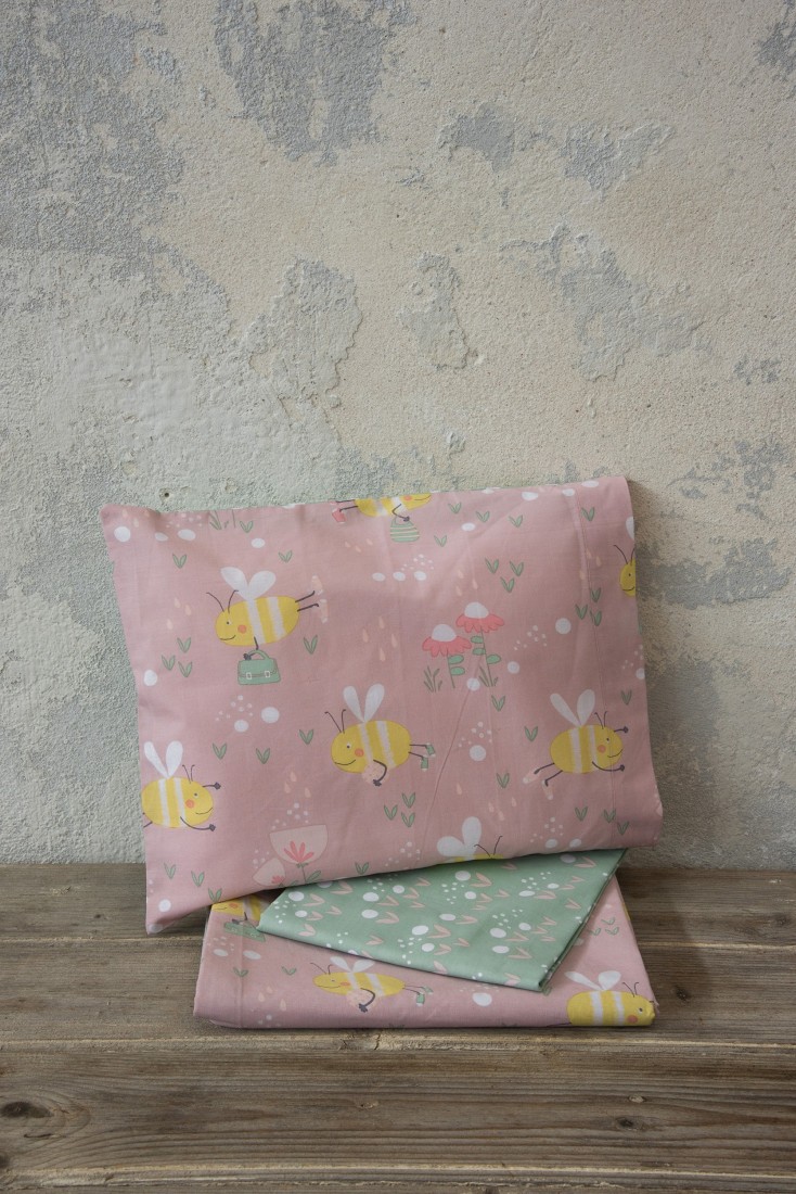 To σετ σεντόνια κούνιας και λίκνου Bumblebee έχει μοντέρνα απόχρωση του ροζ σαν φόντο και φωτεινά κίτρινα παιχνιδιάρικα μελισσάκια και λουλουδάκια σε όλη την επιφάνεια. Το κατωσέντονο σε μια επίσηε μοντέρνα απόχρωση του πράσινου, δημιουργεί μια αρμονική αντίθεση και δίνει την αίσθηση της χαλάρωσης στο βρεφικό δωμάτιο. Το μωράκι σας θα ανακαλύπτει κάθε μέρα κάτι διαφορετικό στα σχέδια τους και θα μοιράζεται μαζί σας τα πρώτα του γέλια. Συνδυάστε το με ασορτί πάντα και κουβερλί για να δημιουργήστε την πιο γλυκιά ατμόσφαιρα στο δωμάτιο του μωρού σας.