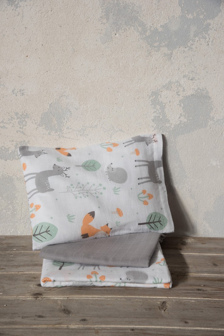 To σετ σεντόνια κούνιας και λίκνου Woody δίνει μια παραμυθένια νότα στο βρεφικό δωμάτιο. Έχει πρωτότυπο τυπωτό σχέδιο με ζωάκια του δάσους και μοντέρνους χρωματικούς συνδυασμούς του γκρι με το πορτοκαλί και το χρώμα της μέντας πάνω σε λευκό φόντο που θα αναδείξουν αμέσως την κούνια και το λίκνο του μωρού. Το μωράκι σας θα λατρέψει τα χαριτωμένα ζωάκια και θα μοιραστεί μαζί σας τον ενθουσιασμό του. Συνδυάστε το με την ασορτί κουβέρτα για την πιο όμορφη διακόσμηση στο βρεφικό δωμάτιο.