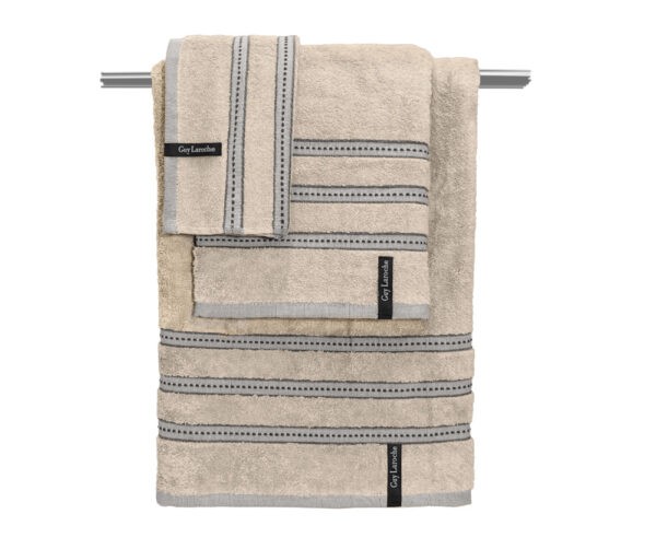 Σετ πετσέτες 3 τεμαχίων της εταιρείας Guy Laroche. Περιλαμβάνεται μία πετσέτα χεριών η οποία είναι κατάλληλη για συχνή χρήση, αφού η ανάγκη του να πλένουμε τα χέρια μας είναι τακτική. Είναι μικρή και εύχρηστη, αλλά λόγω του ότι βρέχεται συχνότερα από τα υπόλοιπα είδη πετσετών, απαιτεί τακτική αλλαγή και πλύσιμο. Επίσης περιλαμβάνεται μία πετσέτα προσώπου, η οποία αποτελεί απαραίτητη προσθήκη σε κάθε μπάνιο για τη μέγιστη υγιεινή του προσώπου. Θα πρέπει να υπάρχει πάντα ξεχωριστή πετσέτα για το πρόσωπο, ώστε να μην μεταφέρονται μικρόβια που υπάρχουν σε άλλες πετσέτες. Κάθε μέλος του σπιτιού θα πρέπει να έχει τη δική του πετσέτα για μέγιστη υγιεινή. Τέλος, περιλαμβάνεται μία πετσέτα σώματος η οποία αποτελεί το πιο βασικό είδος πετσέτας για χρήση μετά το ντουζ ή το μπάνιο σας. Η πετσέτα σώματος θα πρέπει να αλλάζει και να πλένεται 1 με 2 φορές τη βδομάδα, καθώς μετά από κάθε μπάνιο γεμίζει με βακτήρια. Επίσης μετά από κάθε χρήση η πετσέτα θα πρέπει να στεγνώνει εντελώς και γρήγορα, καθώς όσο περισσότερο μένει υγρή, τόσο περισσότερο πολλαπλασιάζονται τα βακτήρια.