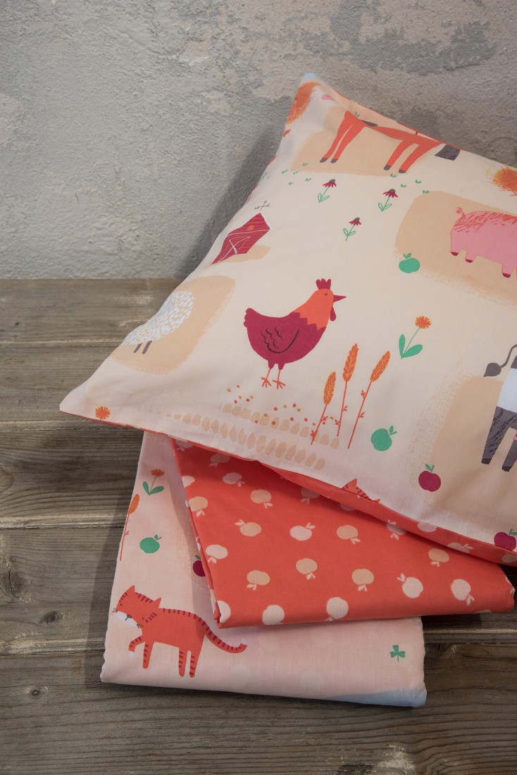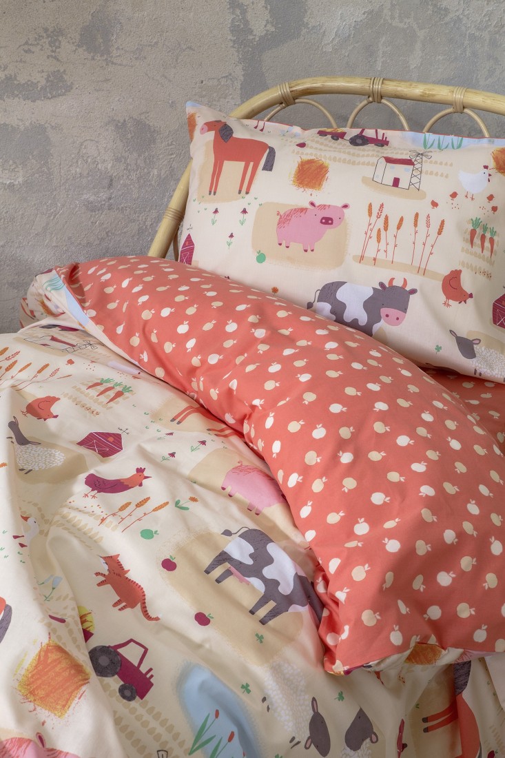 Τα παιδικά σεντόνια Farmland γεμίζουν το παιδικό δωμάτιο με χαρά από τις ιστορίες της φάρμας. Έχουν υπέροχες μπεζ και πορτοκαλί αποχρώσεις και χαρούμενο τυπωτό σχέδιο με τα ζωάκια και τη φύση της φάρμας. Θα δώσουν αφορμή για παιχνίδι και γέλια προσφέροντας τροφή στην παιδική φαντασία. Παράλληλα, μπορούν να βοηθήσουν τους γονείς να γνωρίσουν στα παιδιά τη ζωή στη φάρμα και τα παιδιά να ονειρευτούν παρέα με τα αγαπημένα τους ζωάκια.