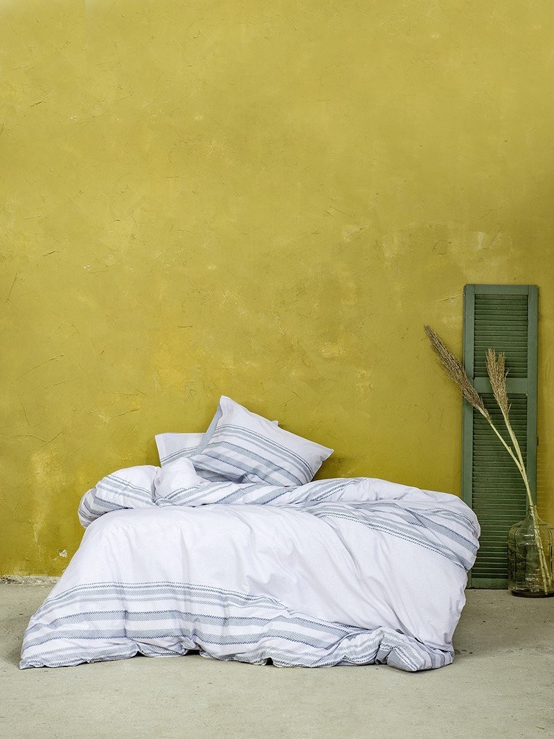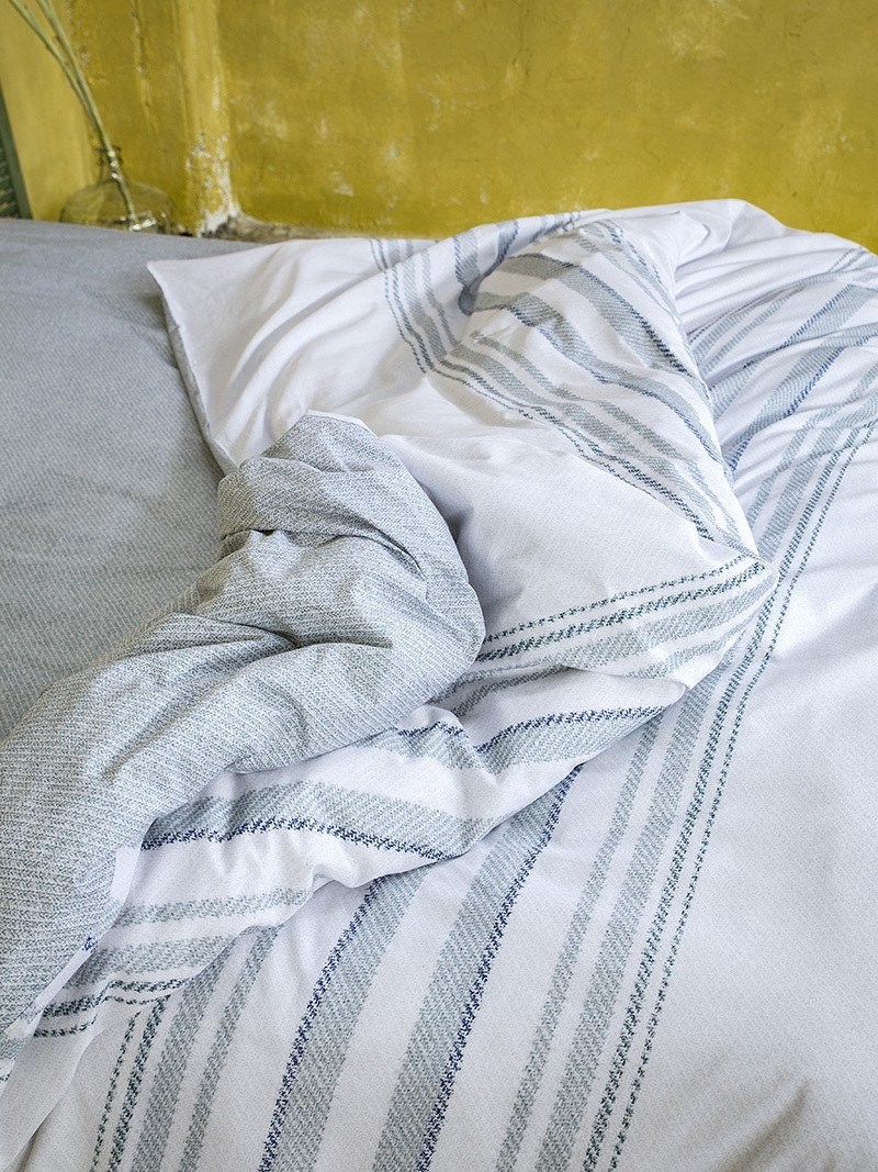 Τα βαμβακερά σεντόνια Level Blue έχουν διαχρονικό ριγέ γεωμετρικό μοτίβο στις μοντέρνες αποχρώσεις του γκρι - γαλάζιου πάνω σε εκρού βάση με μια πινελιά σκούρου μπλε, που τονίζει το διακριτικό ριγέ σχέδιό τουs. Ταιριάζουν σε χώρους με μοντέρνα, αλλά και με κλασική διακόσμηση μιας και μπορούν να σταθούν ως το επίκεντρο της συνολικής αισθητικής του χώρου. Δώστε στο υπνοδωμάτιο σας προσωπικότητα με μια από τις πιο σύγχρονες τάσεις σε μια ανάλαφρη εκδοχή.