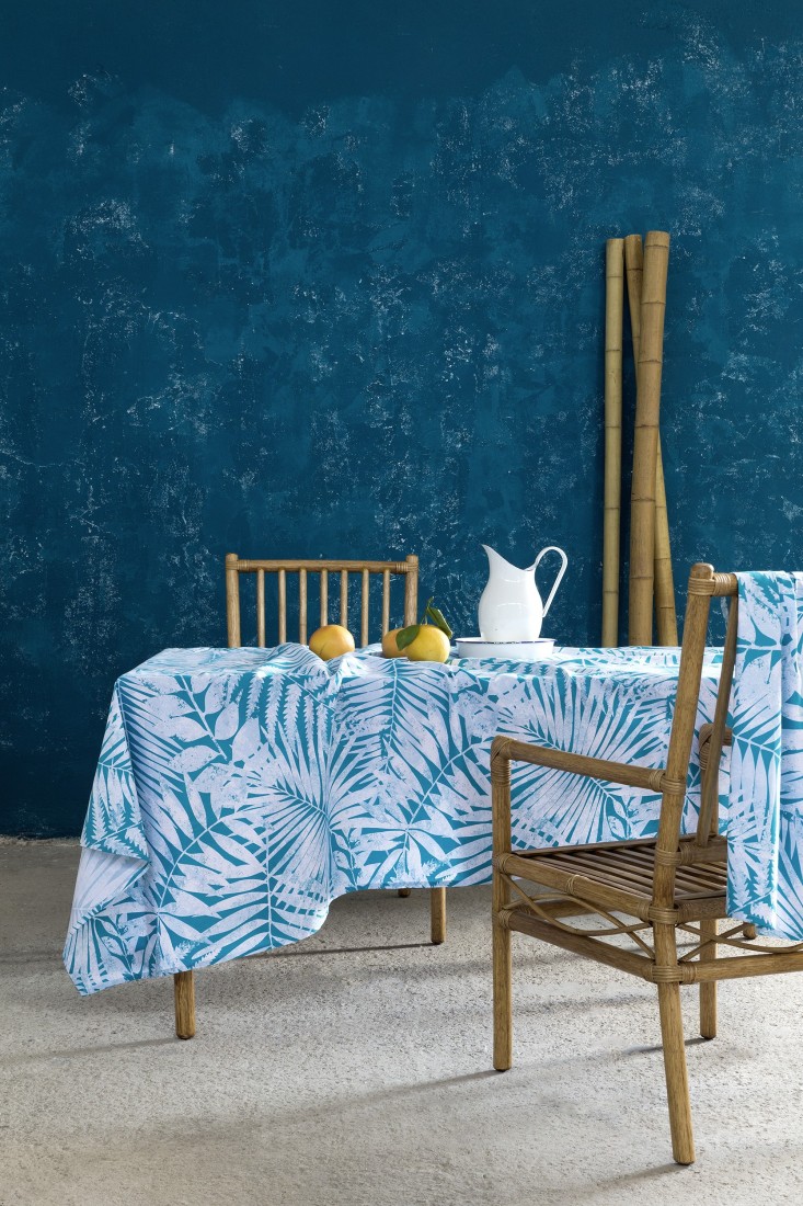 Το τραπεζομάντηλο Feral έχει ένα μοναδικό tropical jungle μοτίβο που θα φέρει τις φυλλωσιές ενός τροπικού τοπίου στη διακόσμηση του χώρου σας. Σε υπέροχο μπλε χρώμα της που θυμίζει ελληνικές θάλασσες, χαρακτηρίζει την ηρεμία και δημιουργεί ατμόσφαιρα χαλάρωσης, είναι ιδανικό για την ώρα του φαγητού. Το σχέδιό τους ανήκει στις πιο αγαπημένες, σύγχρονες τάσεις της μόδας και θα ξεχωρίσει αμέσως στον χώρο. Προσφέρεται σε τέσσερις διαστάσεις ανάλογες με το μέγεθος του τραπεζιού.