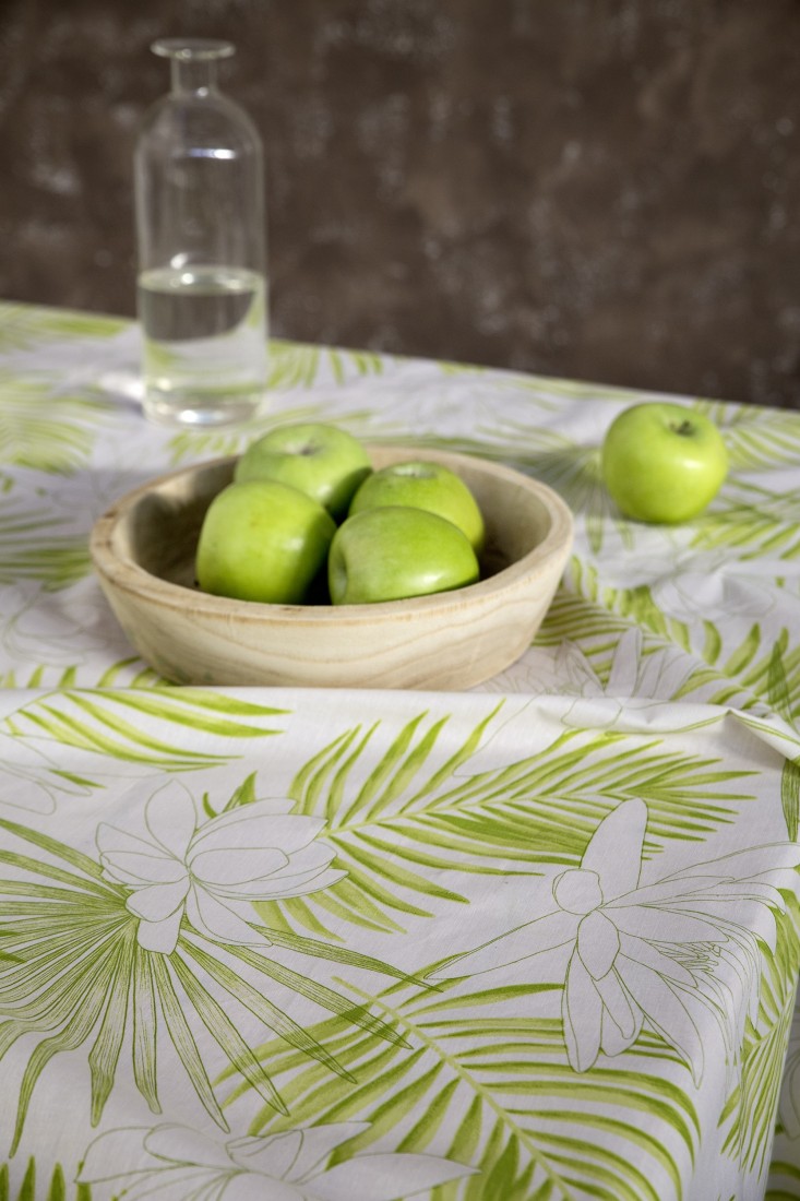 Το τραπεζομάντηλο Fougere έχει ένα μοναδικό tropical jungle μοτίβο που θα φέρει τις φυλλωσιές ενός τροπικού τοπίου στη διακόσμηση του χώρου σας. Σε υπέροχο πράσινο χρώμα της ελιάς που χαρακτηρίζει την ηρεμία και δημιουργεί ατμόσφαιρα χαλάρωσης, είναι ιδανικό για την ώρα του φαγητού. Το σχέδιό τους ανήκει στις πιο αγαπημένες, σύγχρονες τάσεις της μόδας και θα ξεχωρίσει αμέσως στον χώρο. Προσφέρεται σε τέσσερις διαστάσεις ανάλογες με το μέγεθος του τραπεζιού.